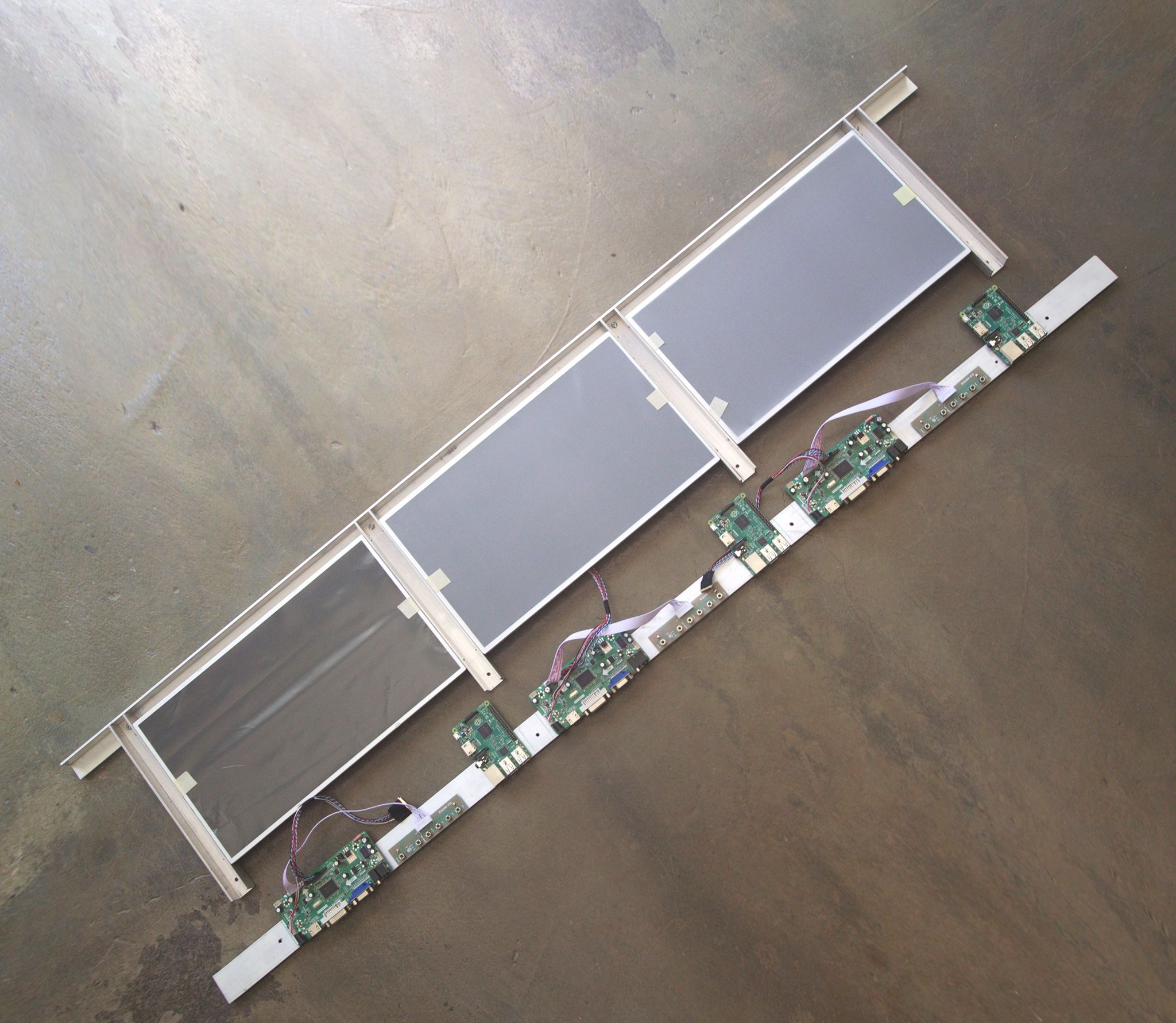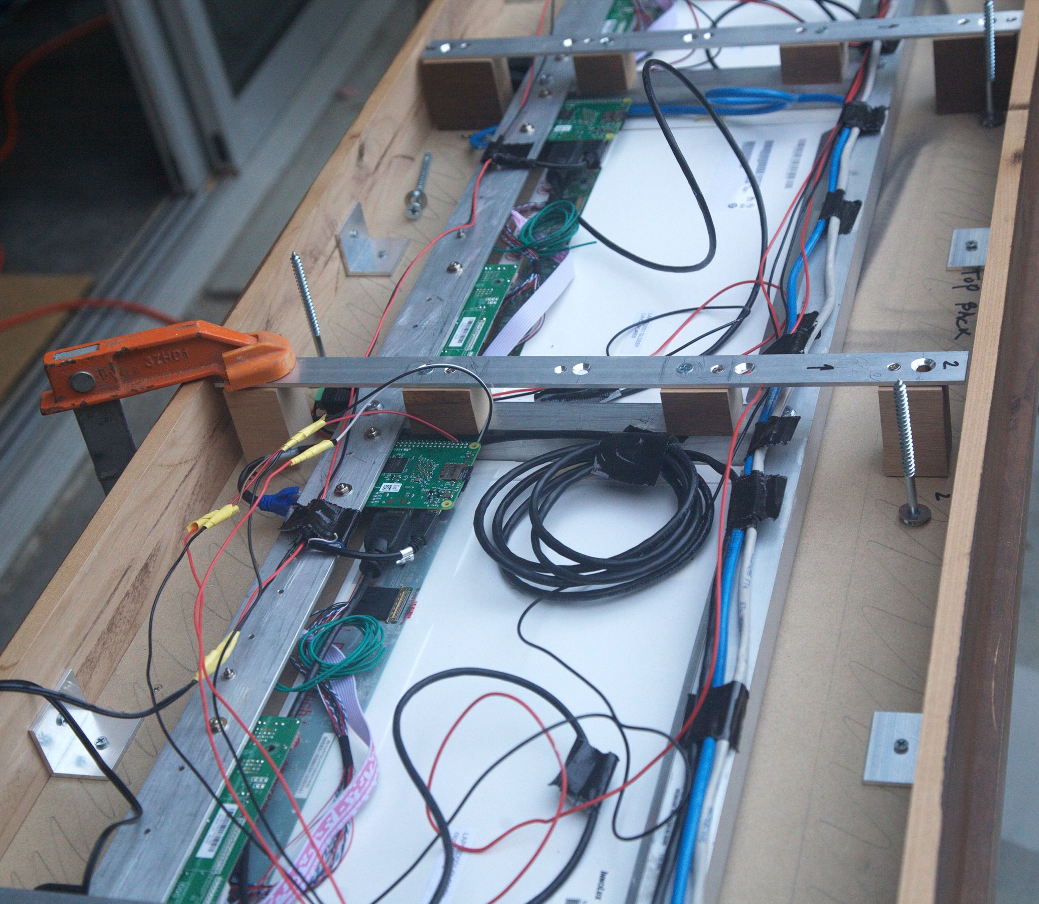 Filmmaker Natasha Maidoff approached me needing a way to display synced video for a multi screen piece at the Google Art Walk. Having multiple view ports embedded into a single piece creates tension between the individual screens and adds a dynamic layer on top of what happens within the boundaries of each. I built an aluminum frame to hold the LCD screens, power supplies and networked raspberry pi computers playing back the video in sync. The whole was then mounted to the wooden frame. more…